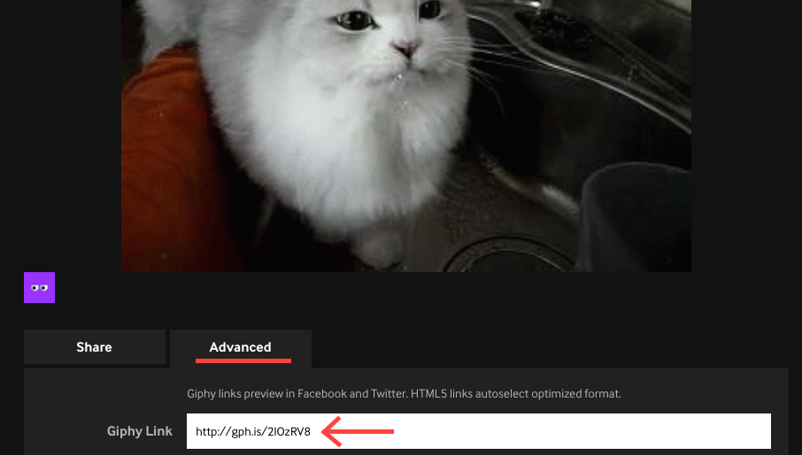 V časti „advanced“ skopírujte GIPHY link, ktorý môžete ľubovoľne použiť, kam potrebujete.