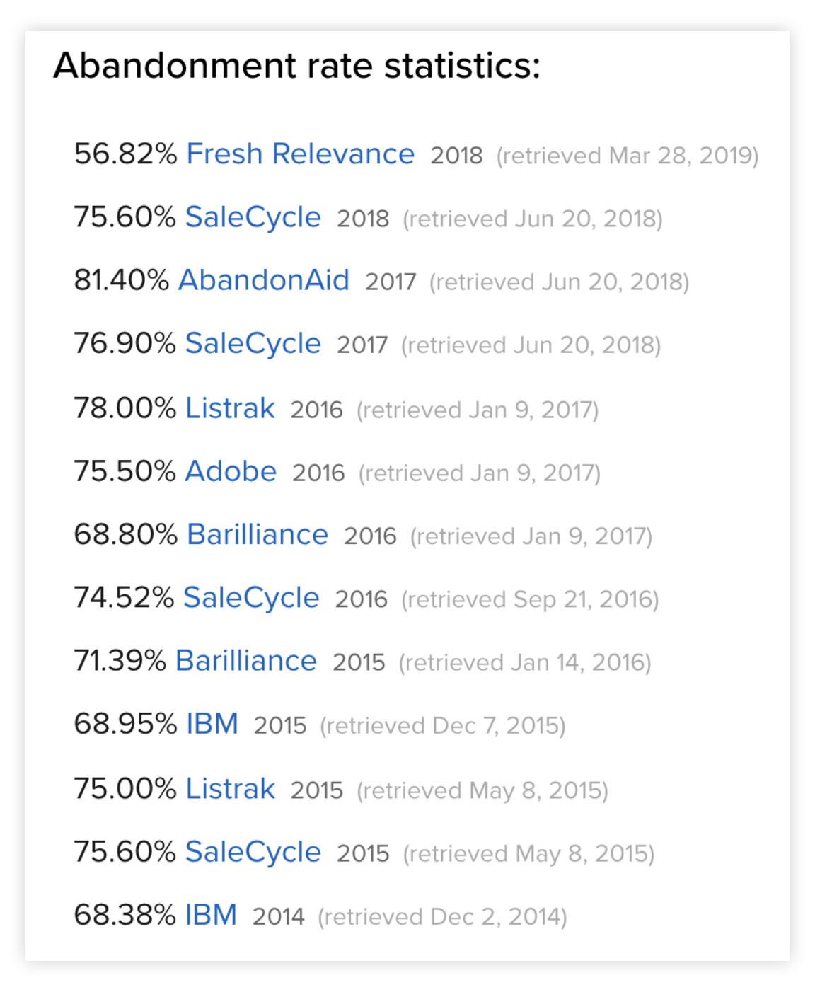 Podľa štatistík niektorých „väčších hráčov” v posledných rokoch opustilo nákupný košík v priemere 69,57 % návštevníkov.